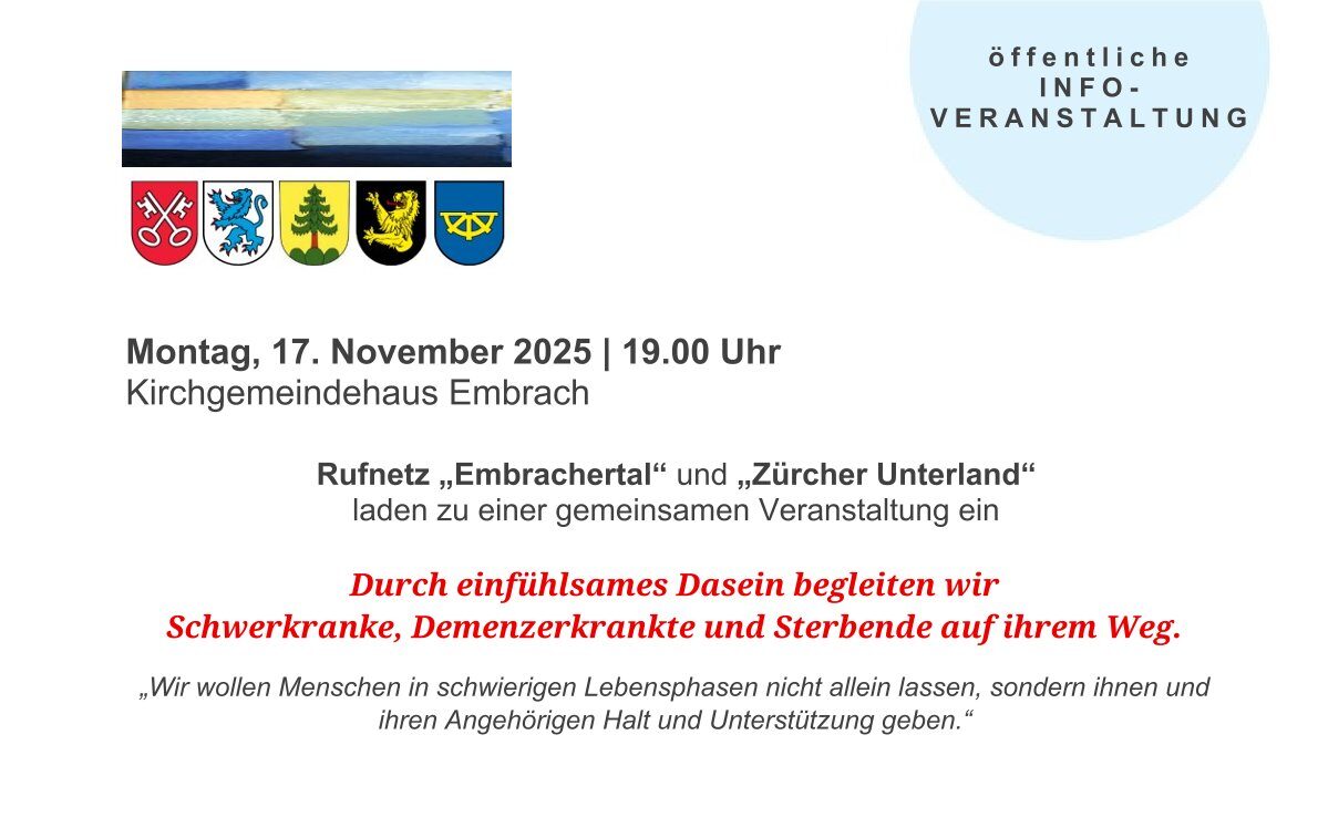 “Durch einfühlsames Dasein begleiten wir Schwerkranke, Demenzerkrankte und Sterbende auf ihrem Weg.” An dieser öffentlichen Veranstaltung erfahren Sie, was Sinn und Zweck der Vereine sind und was ihre Dienstleistungen beinhalten. Gerne erwarten wir Sie am Montag, 17. November 2025 um 19.00 Uhr im Kirchgemeindehaus Embrach. Flyer Veranstaltung Rufnetz